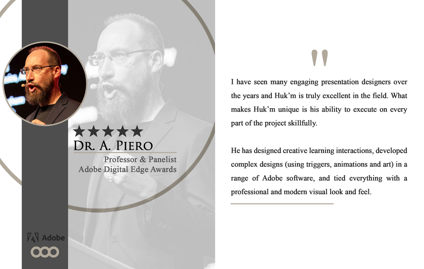 I have gained a reputation as one of the best presentation designers in the field – recognised by leading individuals and companies in Business, Technology, Education, Music, Law and Finance, to name a few.